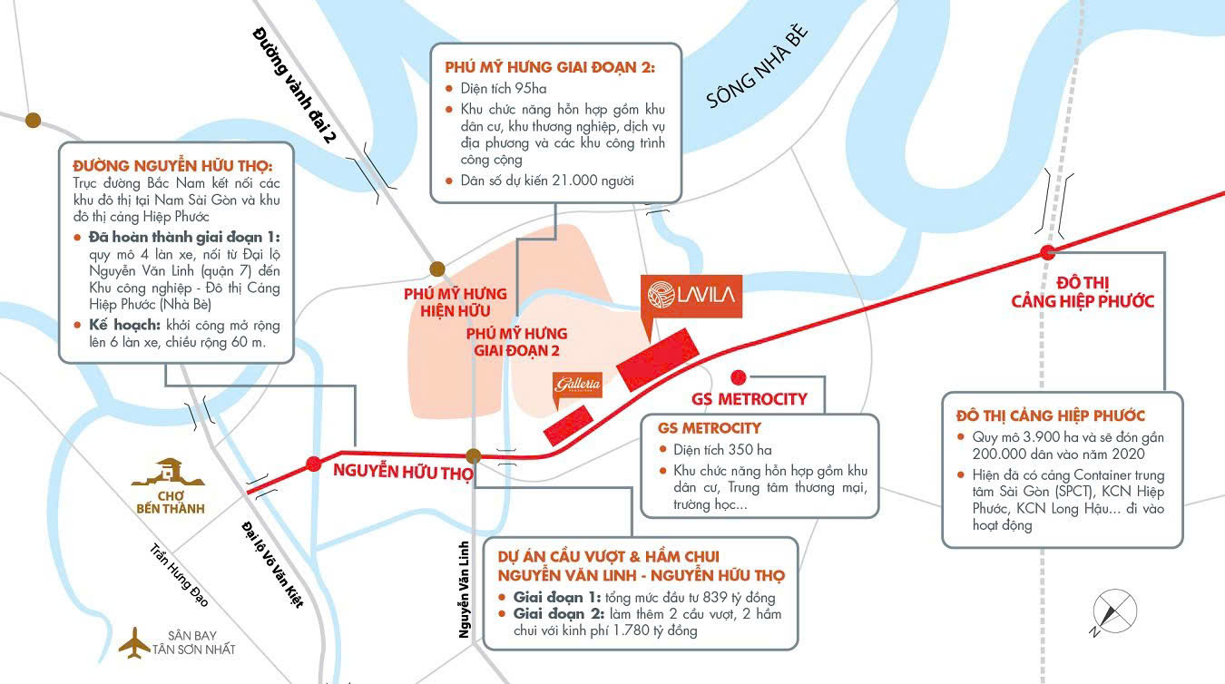 Hàng loạt công trình trọng điểm với tổng vốn đầu tư gần 5 tỉ USD, kết nối khu Nam với trung tâm thành phố như dự án tuyến metro số 4 dài 37,5km kết nối Quận 7, Nhà Bè với các quận trung tâm, Hệ thống hầm chui, cầu vượt tại ngã tư Nguyễn Văn Linh – Nguyễn Hữu Thọ, cùng những tiện ích ngoại khu sầm uất đã hiện hữu như Đại học RMIT, Bệnh viện FV, TTTM SC Vivo City, Crescent Mall, Lotte Mart… không chỉ góp phần giúp giao thông thông thoáng hơn mà còn mang tới nhịp sống hiện đại & sôi động cho khu vực này. Không ngạc nhiên khi nói rằng trục đường Nguyễn Hữu Thọ hiện là nơi ưu tiên lựa chọn để sinh sống và đầu tư của người Việt lẫn nước ngoài. Trong những năm vừa qua, dù thị trường có nóng hay lạnh thì BĐS tại khu vực này vẫn luôn được người mua đón nhận.