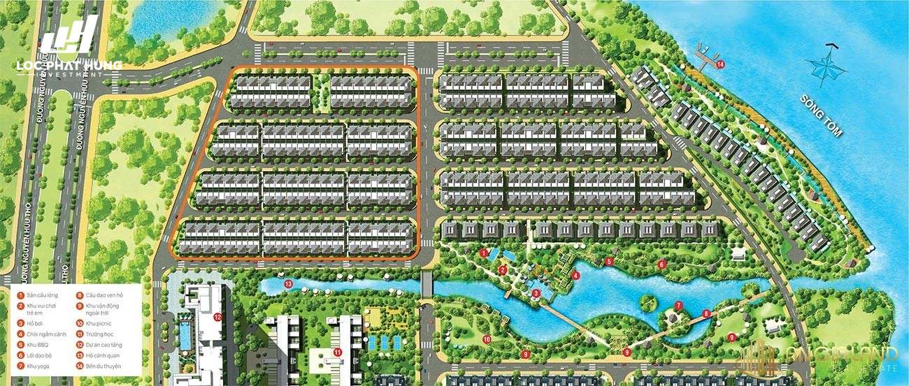Gần 400m tiếp giáp sông Tôm xanh mát, 1ha công viên bờ sông, 4,6ha công viên hồ cảnh quan với thiết kế đẳng cấp và duy nhất, lấy cảm hứng từ công viên nổi tiếng Keukenhof (Hà Lan), nội khu được quy hoạch thành 3 phân khu với nhịp điệu tự nhiên và toàn khu được liên kết chặt chẽ bằng những lối đi bộ, những thảm hoa cỏ trải dài, những cây cầu ven hồ: